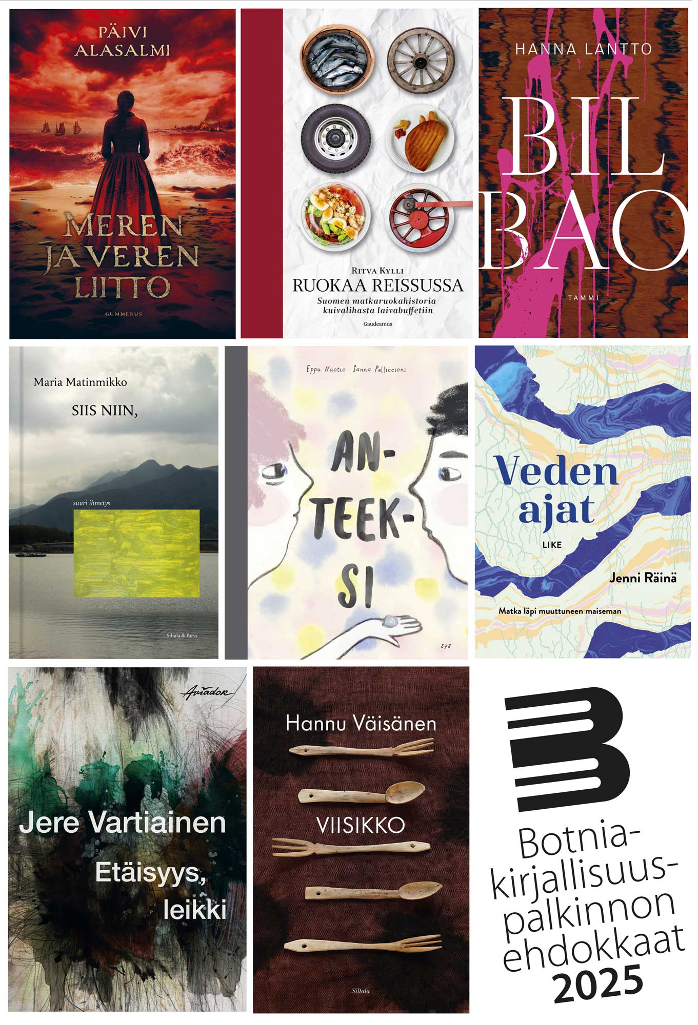 Botnia-kirjallisuuspalkinnon raati sai tänä vuonna luettavakseen yli 90 teosta. Vaativan, mutta antoisan luku-urakan ja analyyttisen keskustelun päätteeksi raati nimesi palkintoehdokkaiksi kahdeksan loistavaa teosta, mikä on sääntöjen mukainen enimmäismäärä. Ehdokaslistalla on kolme romaania, joista yksi on esikoisromaani, kaksi tietokirjaa, lastenkirja, runoteos sekä runoesseekokoelma.