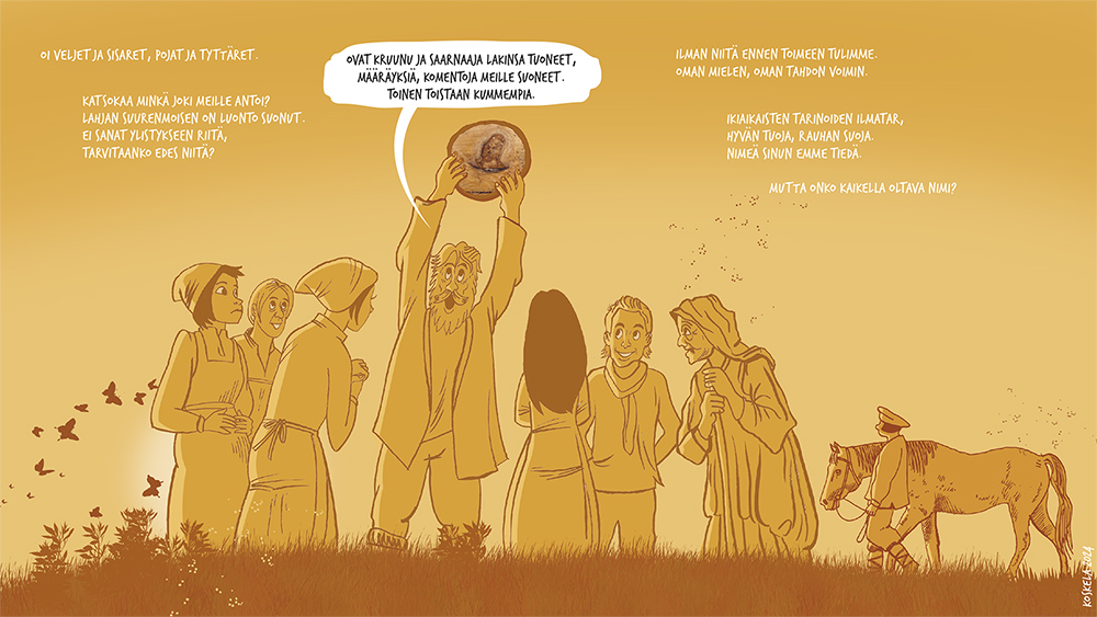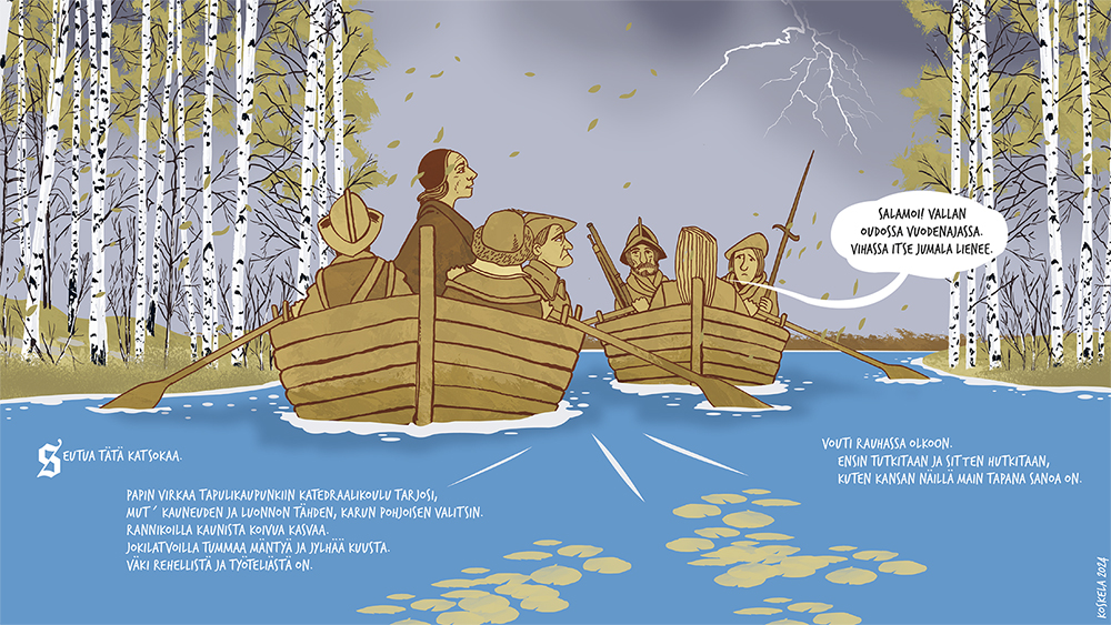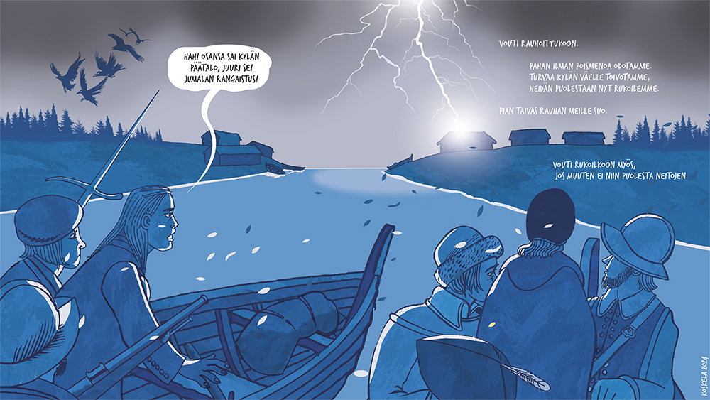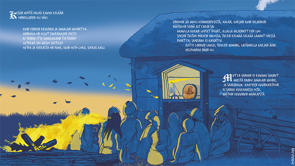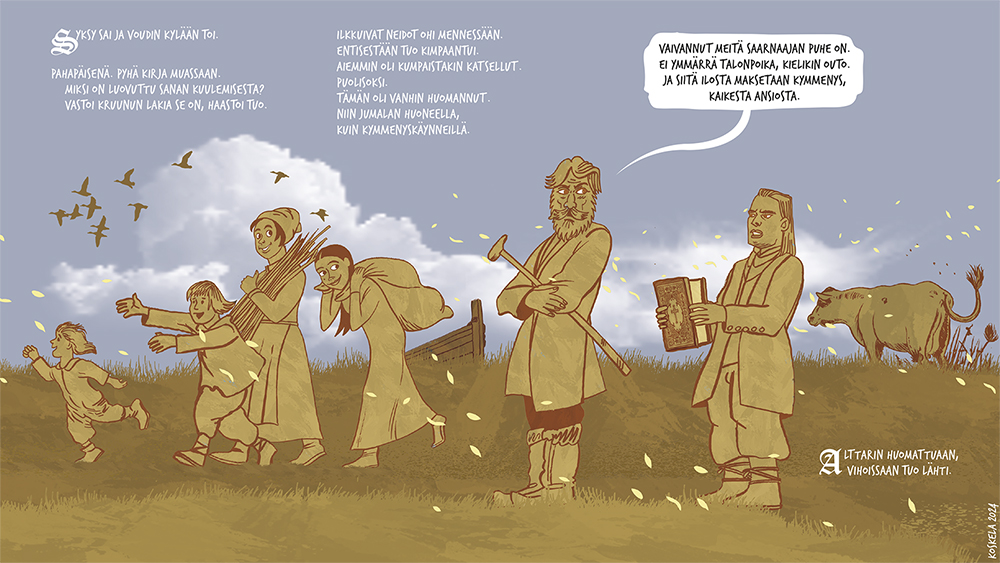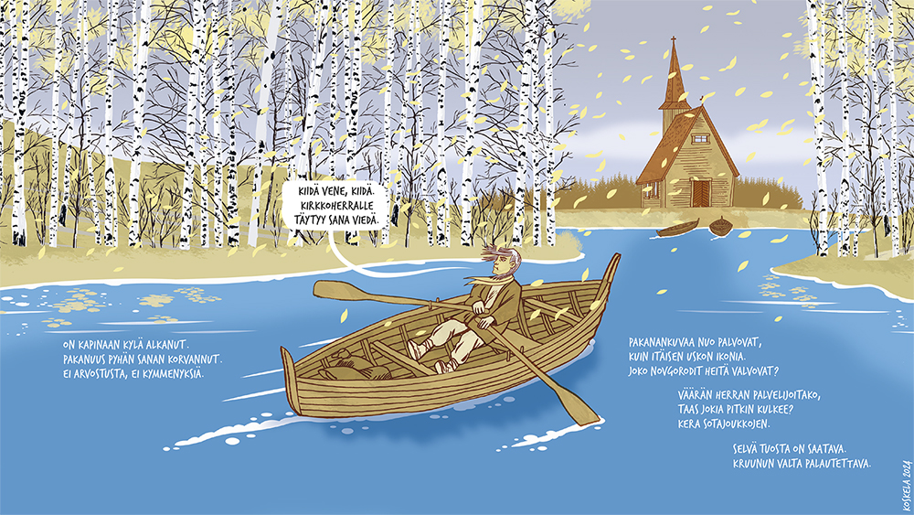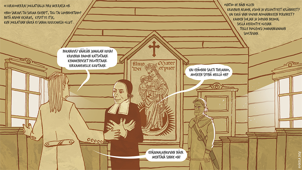 Joessa ui puu, jonka vuosirenkaat muodostavat ikonin. Nuori poika löytää puun ja sahaa päädyn irti. Kylässä tämä on jumalallinen merkki. Vain muutamia vuosikymmeniä aiemmin kylän väki on käännytetty kristinuskoon. He eivät pidä komentelevista papeista saati veronkeruusta. Ikonille rakennetaan pieni katoksellinen suoja ja sitä aletaan palvoa hiljaisuuden vallitessa, ilman saarnoja, rukouksia ja virsiä. Kyläläisille tämä on paluu vanhaan hyvään aikaan. He eivät käy enää kirkossa, kuten kruunu on määrännyt. Myös kymmenysten eli verojen maksu katkeaa. Vouti saapuu tutkimaan asiaa – morsiamen katsastus mielessään – eikä pidä näkemästään. Hän ilmoitta papille, joka lähtee voudin ja asemiesten kanssa kohti kylää. Matkan aikana oudon, myöhäissyksyisen ukonilman salama sytyttää ikonin tuleen. Pappi seurueineen näkee ongelman poistuneen, mutta luonto on ratkaissut asian eri tavalla.